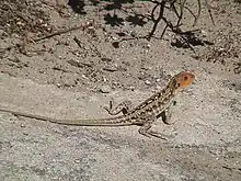 Like most agamids, painted dragons are swift-moving reptiles, capable of impressive sprints over short distances.[8] This diurnal (day-active) lizard, like the majority reptiles, is an ectotherm meaning that it has to rely on its environment to regulate body temperature and as a result will spend considerable time basking to absorb heat.[9] Known to be especially fond of low vegetation and ground debris such as fallen logs and branches,[5] it occupies short burrows often concealed at the base of shrubs such as saltbush.[4][6] Unlike the majority of other agamids which like to perch in elevated places,[8] this species prefers to rest on low branches,[4] from which it will forage over the surrounding open areas and ground litter.[4][5][6] When disturbed or alarmed it will quickly retreat to the safety of the nearby burrow.[6]