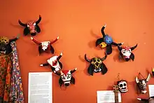 Los Diablos (the devils) is the best known Afro-Mexican dance in the Costa Chica with dancers wearing devil's mask and dancing with wild, exaggerated movements. They are attended by assistants with whips.[6] From 30 October to 1 November, the dancers leave the cemetery to dance, eat offerings of food and more. They spend three days in the streets with dance, music, and theatrical antics before “returning” to the grave. The two main dancers represent the chief of the devils called Tenango or Pancho along with his wife called La Minga, the mother of devils who also appears in other regional dances. The dance as various influences including African and Catholic. While the dance and dressing up as devils were exclusively for men, this has changed as many have left to work outside of the Costa Chica. Women and children have now participated in the annual ritual.[8] Other dances in the municipality include El Torito (the little bull), which is centered on a frame in the shape of a bull that goes through town with residents dancing around it. Versions of La Conquista and Doce Pares de Francia have unusual characters such as Hernán Cortés, Cuauhtémoc, Moctezuma, Charlemagne and Turkish horsemen. Las Chilenas are dances with erotic movements.[6]