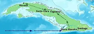 The yacht Granma departed from Tuxpan, Veracruz, Mexico, on 25 November 1956, carrying the Castro brothers and 80 others including Ernesto "Che" Guevara and Camilo Cienfuegos, even though the yacht was only designed to accommodate 12 people with a maximum of 25. On 2 December,[63] it landed in Playa Las Coloradas, in the municipality of Niquero, arriving two days later than planned because the boat was heavily loaded, unlike during the practice sailing runs.[64] This dashed any hopes for a coordinated attack with the llano wing of the Movement. After arriving and exiting the ship, the band of rebels began to make their way into the Sierra Maestra mountains, a range in southeastern Cuba. Three days after the trek began, Batista's army attacked and killed most of the Granma participants – while the exact number is disputed, no more than twenty of the original eighty-two men survived the initial encounters with the Cuban army and escaped into the Sierra Maestra mountains.[65]