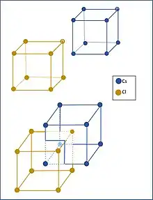 One structure is the "interpenetrating primitive cubic" structure, also called a "caesium chloride" structure. This structure is often confused for a body-centered cubic structure, because the arrangement of atoms is the same. The true structure is shown in the graphic showing two individual primitive cubic structures that are superimposed within each other with the corner of one structure in the center of the cube of the other structure. It helps to convince yourself that it is not body-centered cubic because there is no translational symmetry along the ½, ½, ½, plane, the chloride would be translated into a cesium, not another chloride.[6]