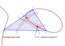 The cubics listed below can be defined in terms of the isogonal conjugate, denoted by X*, of a point X not on a sideline of △ABC. A construction of X* follows. Let LA be the reflection of line XA about the internal angle bisector of angle A, and define LB and LC analogously. Then the three reflected lines concur in X*. In trilinear coordinates, if then