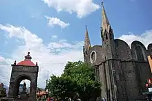 The Juárez and Morelos Gardens are in the center of the city, both of which are plazas lined with trees. Between the two is the State Government Palace, a three-story building with a tezontle façade built between 1955 and 1969. The Morelos Garden dates from 1908 and is easily recognizable by the large stone statue of José María Morelos, which is known colloquially as "Morelotes". The Juárez Garden is located to the north of the State Government Palace and is the oldest public square in Cuernavaca.[40] The Garden contains a kiosk sometimes said to be designed by Gustave Eiffel[43][44] and brought from Britain toward the end of the 19th century.[41] Unlike most main squares in Mexico, neither of these open up the way to the main cathedral. The main cathedral in Cuernavaca is located a few blocks west of the square.[40]