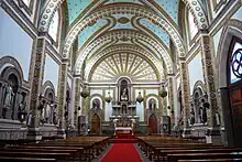 The main entrance is on Hidalgo Street, where one passes between two large chapels called the Chapel of Santa Cruz and the Chapel of the Tercera Orden. The Tercera Orden is considered to be the more valuable artistically of the two, with its highly sculpted early Baroque main and side portals painted in various colors. Inside, there is a later Churrigueresque main altar. A third chapel, called the Chapel of Nuestra Señora de los Dolores is farther into the atrium and near the Open Chapel of San José.[40] The bell tower was added in 1713. The cathedral was damaged during the September 2017 earthquake, but it has since been restored.[45][46]