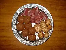 Kashmiris consume meat voraciously.[10][11] They share a love for lamb; the love a Kashmiri has for meat is unparalleled.[12][11] A good Kashmiri would not touch frozen meat, they feel it is not suited for the local cuisine.[13] They are, per capita, the highest mutton consumers in the subcontinent.[12] According to official data, around 2.2 million sheep are slaughtered in Kashmir every year on an average adding up to 21,000 tonnes annual meat consumption in the region.[14] Kashmiri Pandits are all Saraswat Brahmins, and hence avid meat-eaters.[15] The amount of mutton that is generally required to be bought for a Kashmiri Pandit wedding feast is 650 gm per head (not considering chicken).[16] Kashmiri Muslims prefer goat, especially young, while Kashmiri Pandits choose lamb.[17] Meat is called Neni by Pandits and Maaz by Muslims in Kashmir.[18] Asafoetida is mixed with yoghurt by Pandits and shallot mixed with garlic by Muslims.[5] In a majority of Kashmiri Pandit and Muslim cooking, bread is not part of the meal; it's always rice at lunch or dinner.[19] Bread is only eaten with tea in the morning or evening.[19] They may be bought from neighbourhood bakeries (qandurwan).[9]