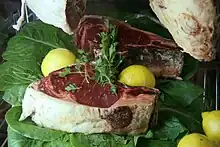 Dishes include lechazo asado (roast veal or lamb), cochinillo asado (roast suckling pig), cordero asado (roast lamb), morcilla (blood sausage or black pudding), asados al Sarmiento (roasted meat with wine), a typical dish in Santibáñez de Valcorba and environs, chuletones de buey (a large ox steak) with ajillo (garlic), typical in Peñafiel). The embutido (sausage) called chitas (cheetahs) is well known, prepared with the meat of suckling pig in adobo.