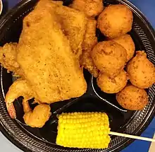 Gulf seafood like black grouper, shrimp and swordfish can be found, and "channel catfish" (Ictalurus punctatus) farmed locally in the Mississippi Delta region is especially popular in Oxford, Mississippi. Fried catfish battered in cornmeal is commonly served at local establishments with hot sauce and a side of fries and coleslaw. Oysters Rockefeller is a New Orleans specialty, believed to have originated in the state. Creole dishes like gumbo and jambalaya often feature crawfish, oysters, blue crab and shrimp.[4]