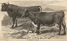 Glamorgan cattle is a Welsh traditional cattle breed with a chestnut coloured coat and a broad white stripe which runs along the backbone to the tail and under the abdomen. Morgan Evans comments that the breed was once highly prized and belongs to a class of cattle called middle-horns. In character and antiquity of descent they rank with Hereford cattle, South Devon cattle, North Devon cattle, and Welsh Black cattle.[6]