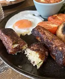 One of the best-known recipes from Glamorgan is the Glamorgan sausage. The sausage got its name from Glamorgan cheese which was a key ingredient. However, with the disappearance of Glamorgan cheese contemporary recipes use Caerphilly cheese. The sausage mix is kept intact by the casing. Freeman preferred to use half white and half brown bread crumbs for the casing and comments that the onions must be finely chopped to keep the sausage mixture together. The egg yolk is divided from the egg white and the dry ingredients of chopped onion, herbs, mustard, and grated cheese are bound together with the egg yolk. The small sausages are then rolled in flour, dipped in the egg white, rolled in bread crumbs and fried. [35]