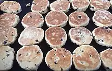 Tibbott mentions recipes for Bakestone Cake (Teisen Lechwan), Bakestone Pie (Teisen ar y Maen) and Bakestone Turnover (Teisen ar y Maen). The dough for Bakestone Turnover and Bakestone Cake is prepared in the same way, although the former uses less fat and sugar. The butter and lard are added to flour, sugar and currants and then beaten eggs and some milk are added to make a soft dough. In the case of a Bakestone Cake, this is rolled out on to a floured board and cut into small rounds which are baked on a bakestone. In the case of a Bakestone Turnover the dough is rolled out to the size of a dinner plate half of which is covered with fruit, such as sliced apple, blackberries or gooseberries. The other half is folded over the fruit and the edges are pressed together and sealed. The pie is also baked on a hot bakestone and the top layer of the pie is split open to add sugar and then re-covered. Tibbott mentions that the Bakestone Turnover was prepared on farms during harvest time.[51]