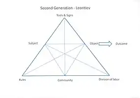 - ↑ In the second generation diagram, activity is positioned in the middle, mediation at the top, adding rules, community and division of labor at the bottom. The minimum components of an activity system are: the subject; the object; outcome; mediating instruments/tools/artifacts; rules and signs; community and division of labor.