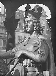 - The Magdeburg Rider, most likely a portrayal of Otto I (together with two maiden flanking him), erected in 1240 and now in the Kulturhistorischen Museum Magdeburg (a famous copy stands at the Alten Markt) is Germany's oldest equestrian statue.[63] As the founder of the city and the diocese, Otto has always had an important role in the city's culture of remembrance. Since 2010, the city has been called the Ottostadt (Otto's city)[64][65] The Magdeburg Rider influenced Maximilian I's plan for his own equestrian monument.[66]
