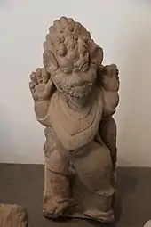 Statue of a pair of lions often founds in temples in Southeast Asia as the gate guardian. In Borobudur Buddhist monument Central Java, Indonesia andesite stone statues of lions guarding four main entrances of Borobudur. The thrones of Buddha and Boddhisattva found in Kalasan and Mendut buddhist temples of ancient Java depicted elephant, lion, and makara. The statue of a winged lion also is found in Penataran temple East Java, as well as in Balinese temples. The Balinese winged lion often served as the guardian statue or as the pedestal of wooden column.