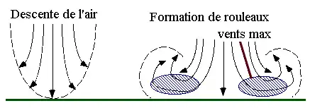 Downbursts are dangerous for many reasons.[21] First, downdraughts under cumulonimbus can be severe and extensive. A sailplane flying at 50 knots in a downdraught of 15 knots has an approximate glide ratio of 3, meaning that it covers only about three metres of ground for every metre it descends. Assuming that the glider is at cloud base height at 2,000 metres (6,600 ft), if it remains in the downdraught the entire time, it will only be able to glide 6 kilometres (3.7 mi) before being forced to land – likely under difficult and dangerous conditions. Even if the glider lands safely, it could be destroyed later by a wind gust. So when a rain curtain shows a downburst, it is of paramount importance to not land in this area.