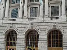 Within the four-story base, the central section is recessed slightly.[31] The first floor contains five double-height arches, set within rusticated masonry, facing Broadway.[13][31] The rusticated arcade is designed in a manner similar to that of 16th-century Italian villas.[13] The center three arches, within the recessed central pavilion, lead to the Great Hall; the southernmost arch leads to the elevator lobby for the office space above; and the northernmost arch led to a banking area on the north side of the building.[15] All the arches contain doors and windows with bronze frames.[32] The third and fourth floors contain an Ionic-style loggia structure supported by Tuscan-style column pairs. Above the base, the facade is mostly composed of smooth limestone, except for rustication around the fifth story windows. The columns of windows around the central pavilion, which is recessed further, are also set within a rusticated facade. The outer pavilions are set back beyond the 18th story to comply with the 1916 Zoning Resolution. The central pavilion contains a loggia between the 19th and 21st stories, also supported by Tuscan-style column pairs, and includes a mansard roof above the 22nd story. The roofs of the outer pavilions, above the 22nd story, are flat.[31]