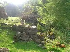 An unusual building of some antiquity stands as a substantial ruin beside the river Annick Water in the holm on the southern bank. A road through the woods connects the site to the stables and to the location of the old Mansion House. This building's remains are constructed of sizeable river boulders as foundations and well worked and carved freestone or sandstone ashlar blocks. It had a large window and door facing onto the holm, whilst the wall facing the river has largely collapsed and may have had two large windows. The door has been carefully blocked and the 'holm' facing window may have been made into an entrance.