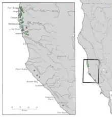 Mendocino cypress occurs in very limited ranges within only Mendocino County, on some of the historical lands of the Yuki Native American people. In Mendocino County the occurrence is in a discontinuous coastal terrace strip, primarily as a pygmy forest associated with bishop pine (Pinus muricata) and Mendocino shore pine (P. contorta var. bolanderi). Occurrences are typically below 500 m in elevation.[12] The Mendocino County official soils survey states that "While not formally recognized as a major forest cover type, the coastal portion of the survey area also includes bishop pine and Mendocino cypress (pygmy) forest types".[14]