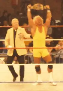 In May 1990, Perfect participated in a tournament for the Intercontinental Heavyweight Championship after previous champion Ultimate Warrior vacated the title upon winning the WWF Championship at WrestleMania VI.[30] Hennig was booked to win the tournament for the vacant title by defeating Jimmy Snuka in the quarter-finals on the May 5 episode of Superstars and two-time Intercontinental Heavyweight Champion Tito Santana in the finals on May 19's episode of Superstars.[30][31][32] After his title win, Perfect enlisted Bobby Heenan as his "perfect" manager[26] and made a successful title defense against Santana on July 28's Saturday Night's Main Event XXVII.[33] Hennig was scheduled to defend the title against Brutus Beefcake at SummerSlam, stemming from his loss to Beefcake at WrestleMania but Beefcake suffered an injury and The Texas Tornado substituted for Beefcake and challenged Hennig to a title match for SummerSlam on August 11's episode of Superstars, which Perfect accepted on the following week's Superstars.[26] Perfect dropped the championship to Texas Tornado at SummerSlam.[16][34][30] Hennig was chosen to lead Demolition as "The Perfect Team" against The Warriors (Ultimate Warrior, Texas Tornado and Legion of Doom) in a four-on-four elimination tag team match at the Survivor Series pay-per-view, where Hennig's team lost.[35] He unsuccessfully challenged Texas Tornado in a rematch for the Intercontinental Championship on November 24 MSG Network special, before regaining the title by defeating Texas Tornado on the December 15 episode of Superstars, with help from Ted DiBiase.[16][26] Perfect defended the title against Texas Tornado in a rematch on the February 2, 1991, episode of Superstars, where he retained the title by losing via countout.[36]