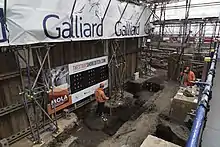 In May 2016, excavators announced that the theatre was purpose-built and, unusually, was a rectangle (measuring 22×25 metres) rather than being round or polygonal.[3] Walls survived up to 1.5 metres (5 ft) high in places; MOLA identified the courtyard, where theatregoers stood, and the inner walls, which held the galleries.[18] The theatre had timber galleries with mid and upper areas for wealthier audience members, and a courtyard made from compacted gravel for those with less to spend.[19] The galleries were straight.[3]