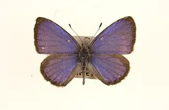 Wet-season brood. male. Upperside: violaceous blue, with brilliant iridescent tints in certain lights. Forewing: the costa, apex and termen bordered with black, this edging narrows from base to the middle of the costa, then broadens greatly at apex, where it occupies the apical fourth of the wing, and is again narrowed below vein 4, whence it is continued as an even band to the tornus; on the disc beyond the apex of the cell the ground colour is sensibly paler, and the dark markings of the cell are faintly visible by transparency from below. Hindwing: the costa very broadly, the termen much more narrowly black; the black bordering on the latter consists of a series of rounded coalescent spots, which on the inner side are margined by faint dark lunules; these are formed not by actual scaling but by the dark markings of the underside which show through more or less clearly.[6]