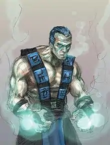 Sub-Zero's early costumes have been very simple due to technical limitations.[17] Mortal Kombat co-creator Ed Boon noted that Kuai Liang's counterpart from DC Comics is Batman as both are "dark, mysterious, brooding characters".[18] Tobias said that Sub-Zero was unmasked in Mortal Kombat 3 in order to stir up fan speculation about the character's backstory.[13] The new Sub-Zero made his official debut on the cover of GamePro April 1995 issue, with Turk's red outfit tinted blue (as it was for the game), but the photo used was a reversed negative, as his scar was over his left eye.[19] Since Mortal Kombat 3, Sub-Zero has had a scar running down from his forehead and across his right eye as a mark of death. The scar was originally red, and later changed to blue in Mortal Kombat: Deadly Alliance as a result of Sub-Zero's enhanced powers. Mortal Kombat and Deadly Alliance states that Sub-Zero is 6 feet 2 inches tall; in recent games such as Mortal Kombat X and Mortal Kombat 11, his sprite appears to be similar to most characters. In Mortal Kombat: Deception, his scar has faded to the point where it can no longer be seen. He now wore an armored uniform heavily inspired by Dynastic era Chinese battle armor, though it was often criticized by fans as being too reminiscent of Teenage Mutant Ninja Turtles villain, the Shredder. However, Sub-Zero's alternate uniform was very reminiscent of Chinese culture, even featuring Sub-Zero without a cowl and a Qing dynasty-era hairstyle. In Mortal Kombat: Armageddon, Sub-Zero reverts to his masked costume from Deadly Alliance, retaining the scar, which is not part of his alternate costume (which is the primary one from Deception). Since Deadly Alliance, Sub-Zero is the only character who has shown considerable signs of aging. Concept art from Deadly Alliance depicted him with a graying, receding hairline, and a more pale and gaunt face, while his scar was now blue and his forearms frozen over. Although Sub-Zero originally had blue eyes, they turned white after he obtained the Dragon Medallion in the game. Sub-Zero's appearance in Mortal Kombat: Shaolin Monks was one of the most revised ones from the title. Character lead Mark Lappin did almost ten passes on his design; producer Shaun Himmerick noted that "we went through literally 5-6 heads and styles of head costume on him" and commented that Sub-Zero's design in Mortal Kombat was difficult to make although most people called it "simple". In the end, the staff was satisfied with his final look in the game as it reminisces them to his classic outfit.[20] His appearance in Injustice 2 was redesigned by Jim Lee.[21]