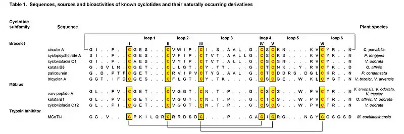 In biochemistry, cyclotides are small, disulfide-rich peptides isolated from plants.[1] Typically containing 28-37 amino acids, they are characterized by their head-to-tail cyclised peptide backbone and the interlocking arrangement of their three disulfide bonds. These combined features have been termed the cyclic cystine knot (CCK) motif. To date, over 100 cyclotides have been isolated and characterized from species of the families Rubiaceae, Violaceae, and Cucurbitaceae. Cyclotides have also been identified in agriculturally important families such as the Fabaceae and Poaceae.[2][3][4]