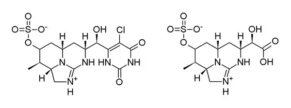 In 1999, an epimer of CYN, named 7-epicyclindrospermopsin (epiCYN), was also identified as a minor metabolite from Aphanizomenon ovalisporum. This occurred whilst isolating CYN from cyanobacteria taken from Lake Kinneret in Israel.[11] The proposed structure of this molecule differed from CYN only in the orientation of the hydroxyl group adjacent to the uracil ring (Figure 4).