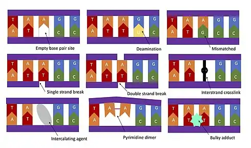 - ↑ Cheng, K. C.; Cahill, D. S.; Kasai, H.; Nishimura, S.; Loeb, L. A. (1992-01-05). "8-Hydroxyguanine, an abundant form of oxidative DNA damage, causes G----T and A----C substitutions". The Journal of Biological Chemistry. 267 (1): 166–172. doi:10.1016/S0021-9258(18)48474-8. ISSN 0021-9258. PMID 1730583.