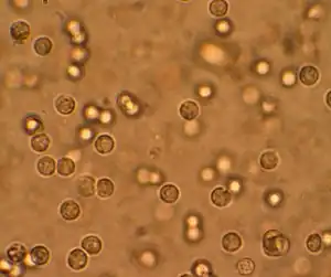 | Multiple white cells seen in the urine of a person with a urinary tract infection using microscopy | |