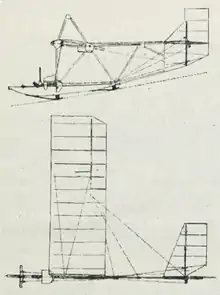 At the rear a broad fin occupied the gap between the upper and lower longerons and had a short, triangular extension above. An almost rectangular rudder ran upwards from the bottom of the fin, extending well above it. The tailplane, mounted on the upper longeron, was triangular in plan. It carried elevators which were rectangular apart from cut-outs for rudder movement.[2]