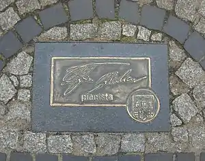 Bydgoszcz Autographs alley is a collection of relief signature embedded into the pavement of Długa street, between the streets Jan Kazimierz and Stefan Batory streets. These granite plaques display Polish meritorious men and women. This theme avenue is the result of a competition run in 2007, aiming at creating new attractions in Bydgoszcz. The competition gathered 123 proposals, the City Hall council settled the contest in November 2007: the author of the winning idea of Bydgoszcz's Autographs alley was Halina Piechocka-Lipka, director of the cultural department of Bydgoszcz.[17] Local artist Michał Kubiak designed the plaques, nominated names are chosen by a committee comprising among others municipality members and university officials.