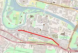 The street is located in the heart of the Old Town. It extends approximately on an east-west axis, from the Zbożowy Rynek ("grain market") near southern tip of Bernardyńska Street to Wool Market square (Polish: Wełniany Rynek). It is approximately 650 metres (2,130 ft) long.