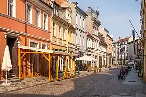 Over the 1990s, the street experienced difficulties to attract and develop of a network of shops, with customers' tendency to leave downtown district. The association "Bydgoszcz Old Town" (Bydgoska Starówka), located at 32, initiated the project of revitalisation of Długa street: it organized events popularizing the area, and thus improved the image of Długa street. Officials helped for the renovation of the houses, for fairs organization and the development of a network of galleries and cafes. The pavement after renovation now integrates old gates outlines, Kujawska's and Poznan's.[16] In recent years, the street received an increasing number of tourists, also attracted by the Old Town and Mill Island's area.