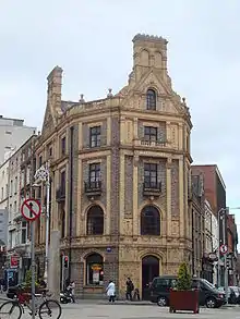 The Lafayette Building, on the junction of Westmoreland Street and D’Olier Street, is a six-storey over basement block which has been described as a "landmark building which looks straight down O’Connell Street and dominates the city streetscape next to O'Connell Bridge".[11] Developed in the 1890s for the Liverpool and Lancashire Insurance Company and designed by architect John Joseph O'Callaghan, it was described as a “Portland stone baronial exercise with Gothic and Ruskinian leanings.”[11] It was redeveloped in the late 1990s when the three top floors of the building were converted into 14 apartments.