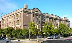 The historic building was designed by Irwin T. Catharine and built in 1922–1924. It is a three-story, eight bay, brick building on a raised basement in the Colonial Revival-style. It features two projecting entrances with stone surrounds and a brick parapet.[2]