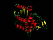 Transpeptidases are members of the penicilloyl-serine transferase superfamily, which has a signature SxxK conserved motif.[8] With "x" denoting a variable amino acid residue, the transpeptidases of this superfamily show a trend in the form of three motifs: SxxK, SxN (or analogue), and KTG (or analogue). These motifs occur at equivalent places, and are roughly equally spaced, along the polypeptide chain. The folded protein brings these motifs close to each other at the catalytic center between an all-α domain and an α/β domain.[9][10]