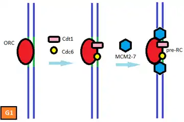 All known mechanisms that prevent DNA rereplication in eukaryotic organisms inhibit origin licensing.[1] Origin licensing is the preliminary step for normal replication initiation during late G1 and early S phase and involves the recruitment of the pre-replicative complex (pre-RC) to the replication origins. Licensing begins with the binding of the multi-subunit ATPase, the origin recognition complex (ORC), to the DNA at the replication origins.[4] Once bound to chromatin the ORC recruits the AAA+ ATPase Cdc6 and the coiled-coil domain protein Cdt1. Cdt1 binding and the ATPase activity of ORC and Cdc6 facilitate the loading of the minichromosome maintenance (MCM) proteins 2-7 onto the chromatin.[1] The MCM complex is the DNA helicase that opens the helix at the replication origin and unwinds the two strands as the replication forks travel along the DNA.[5] Elevated CDK activity at the end of G1 triggers the firing of the origins and the dismantling of the pre-RCs. High CDK levels, which are maintained until the end of mitosis, inhibit or destroy pre-RC components and prevent the origin from relicensing. A new MCM complex cannot be loaded onto the origin until the pre-RC subunits are reactivated with the decline of CDK activity at the end of mitosis. Thus, CDKs serve a dual role in the regulation of eukaryotic DNA replication: elevated CDK activity initiates replication at the origins and prevents rereplication by inhibiting origin re-licensing.[6][7][8] This ensures that no replication origin fires twice in the same cell cycle.[5]