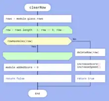 The clearRow function scans all rows bottom-up until it hits a row with no gaps. In such case the row is removed from the grid, the score is increased, and the game's tempo goes up.