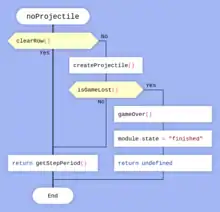 The advanceStep function implements the core logic of the game. advanceStep is a state machine represented as a decision tree.[12] The game engine calls advanceStep periodically. This state machine has three states "playing", "dropping", and "finished". The game takes different actions depending on the current state. For example, in the "playing" state, when there is a falling projectile and the projectile can move down, it is moved down one step.
