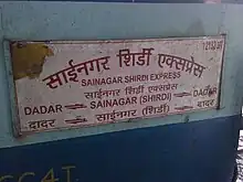 The 12131/12132 Dadar Terminus–Sainagar Shirdi Superfast Express is a Superfast Express train belonging to Indian Railways that run between Mumbai and Shirdi in India. It operates as train number 12131 from Dadar Terminus to Sainagar Shirdi and as train number 12132 in the reverse direction.