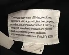 Tag on the inside front pocket of a pair of S/S 2014 Engineered Garments pants. Includes missions statement.