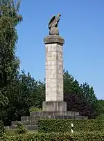 The eagle monument commemorates the old Roman town Ricciacum and is also the symbol of Dalheim. The huge stone blocks forming the solid base of the monument were excavated in the 19th century, not far from their present location. The blocks no doubt date back to Roman times (middle of the 3rd century). They may have been removed from the Roman theatre in order to serve as the foundations of a burgus or defensive watchtower. The monument itself was built by the Archaeological Society of Luxembourg. On 28 May 1855, the groundbreaking ceremony was held in the presence of William III of the Netherlands who was also Grand Duke of Luxembourg. The memorial commemorates the presence of the Romans on Dalheim's Petzel plateau. Standing on a globe, the eagle seems to be looking in the direction of Trier while its body is facing Metz, symbolizing the old road from Metz to Trier.[3]