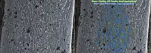 J. D. Verhoeven and A. H. Pendray published an article on their attempts[39] to reproduce the elemental, structural, and visual characteristics of Damascus steel.[11] They started with a cake of steel that matched the properties of the original wootz steel from India, which also matched a number of original Damascus swords that Verhoeven and Pendray had access to. The wootz was in a soft, annealed state, with a grain structure and beads of pure iron carbide in cementite spheroids, which resulted from its hypereutectoid state. Verhoeven and Pendray had already determined that the grains on the surface of the steel were grains of iron carbide—their goal was to reproduce the iron carbide patterns they saw in the Damascus blades from the grains in the wootz.