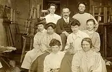 Munich's "Damenakademie" was soon widely known and attracted numerous young women from Germany and abroad who wanted to receive artistic training. In 1906, 427 students "from all over the world" attended the school.[9] In addition to Gabriele Münter and Maria Marc, for example, Käthe Kollwitz also enrolled there. The students of the "School for Women Painters" were taught by Munich artists who also taught at the art academy or privately. For example, Angelo Jank, Ludwig von Herterich,[10] Tina Blau, Maximilian Dasio, Max Feldbauer, Friedrich Fehr, Ludwig Herterich, Adolf Höfer, Angelo Jank, Georg Jauss, Lothar von Kunowski, Christian Landenberger, Franz Marc, Walter Püttner, Ludwig Schmid-Reutte, Albert Weisgerber and Marie Schnür, Johanna Tecklenborg, who was temporarily in charge of the association, and Heinrich Waderé.