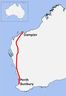 As a single trunkline it is 1530 km long,[4] extending from the Burrup Peninsula in the Pilbara region, to Bunbury in the south west of Western Australia. It supplies gas to industrial, commercial and residential customers in Perth and major regional centres along the pipeline route. It is covered by Western Australian pipeline licence PL-40. A number of lateral pipelines are connected to this pipeline, most of which are covered by separate licences, although PL-40 itself covers the main trunkline and some laterals totalling a length of 1789 km.[2]