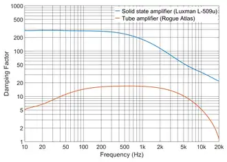 In typical solid state and tube amplifiers, the damping factor varies as a function of frequency. In solid state amplifiers, the damping factor usually has a maximum value at low frequencies, and it reduces progressively at higher frequencies. The figure to the right shows the damping factor of two amplifiers. One is a solid state amplifier (Luxman L-509u) and the other is a tube amplifier (Rogue Atlas). These results are fairly typical of these two types of amplifiers, and they serve to illustrate the fact that tube amplifiers usually have much lower damping factors than modern solid state amplifiers, which is an undesirable characteristic.