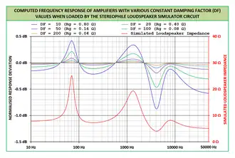 Although extremely high values of damping factor in an amplifier will not necessarily make the loudspeaker–amplifier combination sound better,[9] a high damping factor can serve to reduce the intensity of added frequency response variations that are undesirable. The figure on the right shows the effect of damping factor on the frequency response of an amplifier when that amplifier is connected to a simulated loudspeaker impedance load. This load is moderately demanding but not untypical of high-fidelity loudspeakers that are on the market, and it is based on the circuit proposed by Atkinson.[10] The audio magazines Stereophile and Australian Hi-Fi have recognised the importance of amplifier damping factor, and have made the use of the simulated loudspeaker load a routine part of their amplifier measurements. At around 4 kHz, the real-life difference between an amplifier with a moderate (100) damping factor and one with a low (20) damping factor is about 0.37 dB. However, the amplifier with the low damping factor is acting more like a subtle graphic equaliser than is the amplifier with the moderate damping factor, where the peaks and dips in the amplifier's frequency response correspond closely to the peaks and dips in the loudspeaker impedance response.[8]