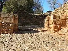 The excavators of Tel Dan uncovered a city gate made of mud bricks on top of megalithic basalt blocs, or orthostats,[21] estimated to have been built during the Middle Bronze Age around 1750 BC.[22] Its popular name is Abraham's Gate, due to the biblical story that Abraham travelled to Dan to rescue his nephew Lot (Genesis 14:14:). The gate was restored in the late 2000s, and has become a popular tourist attraction.[23]