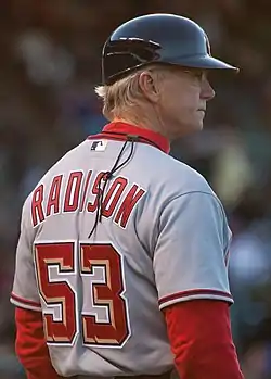 In between, Radison coached in MLB working under Jim Riggleman — like Radison, a veteran of the Cardinal system — with the Padres (1993–94) and Cubs (1995–99).[8] From 2000 to 2009, he was a minor league manager and roving coach for the Yankees and Cardinals. His career minor league managing record is 622–552 (.530), with two championships.[9] On November 20, 2009, he was appointed first-base coach of the Washington Nationals by newly named permanent manager Jim Riggleman.[10]