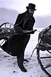 On October 19, the Martin Company was about 110 miles (180 km) further east, making its last crossing of the North Platte River near present-day Casper, Wyoming.[44] Shortly after completing the crossing, the blizzard struck. Many members of the company suffered from hypothermia or frostbite after wading through the frigid river. They set up camp at Red Bluffs, unable to continue forward through the snow. Meanwhile, the original scouting party continued eastward until it reached a small vacant fort at Devil's Gate, where they had been instructed to wait for the rest of the rescue party if they had not found the Martin Company. When the main rescue party rejoined them, another scouting party consisting of Joseph Young, Abel Garr, and Daniel Webster Jones was sent forward. The Martin company remained in their camp at Red Bluffs for nine days until the three scouts arrived on October 28; 56 members of the company had died while they waited. The scouts urged the emigrants to begin moving again. During this interval, the party was met by Ephraim Hanks, bringing meat from a recently slaughtered buffalo. The meat likely saved many lives as the nutritive value was much higher than that of the other supplies. He also performed many blessings and helped in some amputations to stop the progression of the frostbite and gangrene that would have otherwise killed more members of the company. Three days later the main rescue party met the Martin Company and the Hodgett and Hunt wagon companies, and they helped them on to Devil's Gate.[45][46][47]