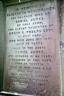 {{cite book}}: CS1 maint: location missing publisher (link) - ↑ Robbens, Ted. DeGrazia, Laura Murphy. (January 2013). The Tombstone of Daniel and Elizabeth Woodbridge (Phelps) James of New York and Liverpool. The New York Genealogical and Biographical Record. p. 45.